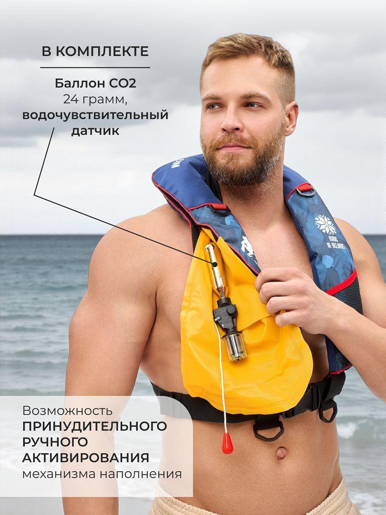 Принцип работы: при попадании в воду жилет автоматически надувается, обеспечивая плавучесть и защиту человека.